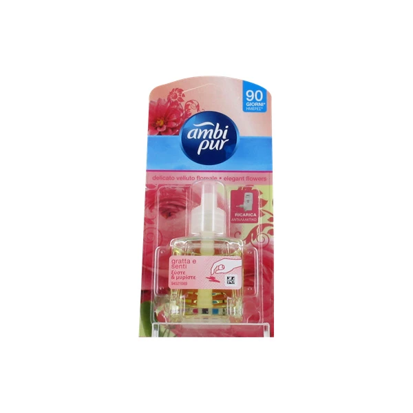 Ricarica per Ambi Pur Diffusore Elettrico. Questo deodorante rilascia una gradevole profumazione floreale in tutti gli ambienti. Dura fino a 80 giorni* Avvertenze: Lasciare uno spazio libero di almeno 50cm attorno alla presa di corrente per assicurare una perfetta evaporazione. È irritante per la pelle. È pericoloso per l’ambiente acquatico. *La durata di 80 giorni si ottiene con l’utilizzo al minimo livello di intensità.