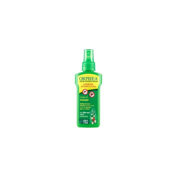 Orphea Protezione Persona Lozione Antipuntura protegge efficacemente la pelle dalle punture di zanzare, tafani, pappataci ed altri insetti. La sua efficacia è tesata anche contro la zanzara tigre (Aedes albopictus). La sua formulazione è a base di Citriodiol, sostanza ad attività insettorepellente di origine vegetale ottenuta dall’Eucalyptus citriodora. L’Aloe vera dona alla pelle un piacevole effetto rinfrescante e idratante. Orphea Protezione Persona Lozione Antipuntura protegge efficacemente la pelle per oltre 5 ore (*dai tafani fino a 3 ore). Non unge ed è gradevolmente profumata. Può essere utilizzata anche sui tessuti. Istruzioni per l’uso: Agitare prima dell’uso. Applicare Orphea Protezione Persona Lozione Insettorepellente spruzzando uniformemente da una distanza di 15 – 20 cm sulle parti da proteggere (mani, braccia, gambe, collo, viso) ed evitando occhi e bocca. È possibile spruzzare il prodotto anche sugli abiti (estremità delle maniche, pantaloni, calze…). Per una migliore protezione si consiglia di ripetere l’applicazione dopo 5 ore.